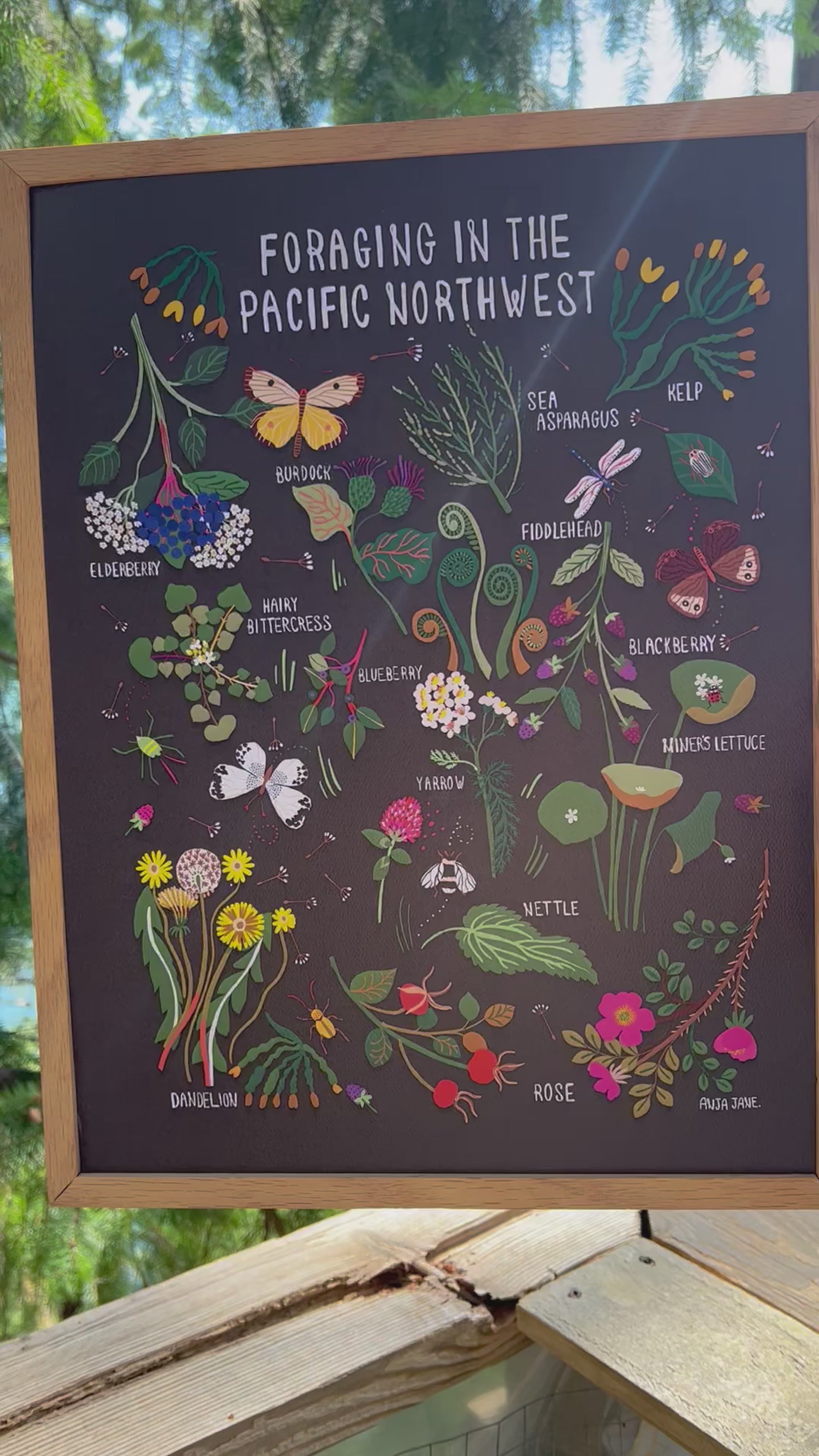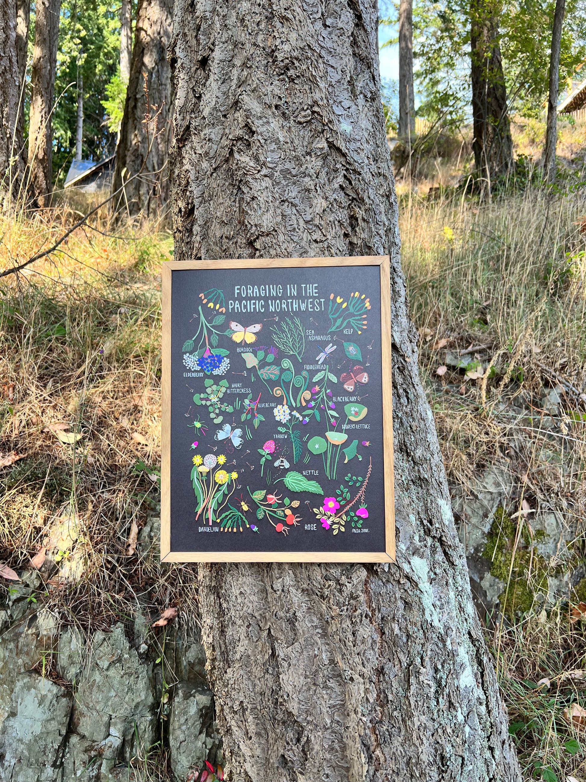 This print illustrates the beautiful flora that you can find and forage in the wilderness around the Pacific Northwest. This includes nettle leaf, rose, elderberry, fiddleheads, hairy bittercress, yarrow, blueberry, blackberry, miner's lettuce, sea asparagus, kelp, and burdock. For some tips on how to use these plants once you've foraged them, check out this blog post here.
