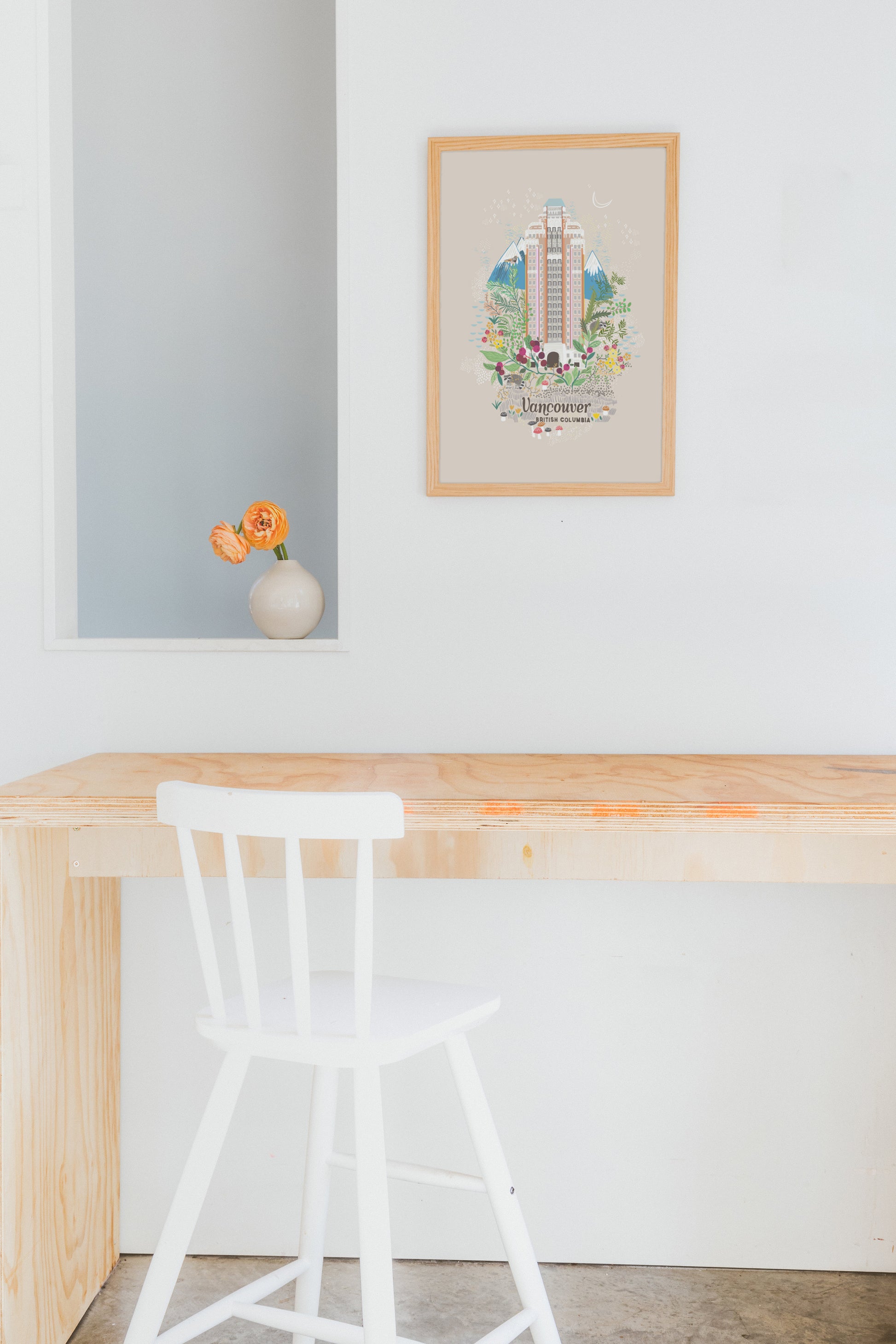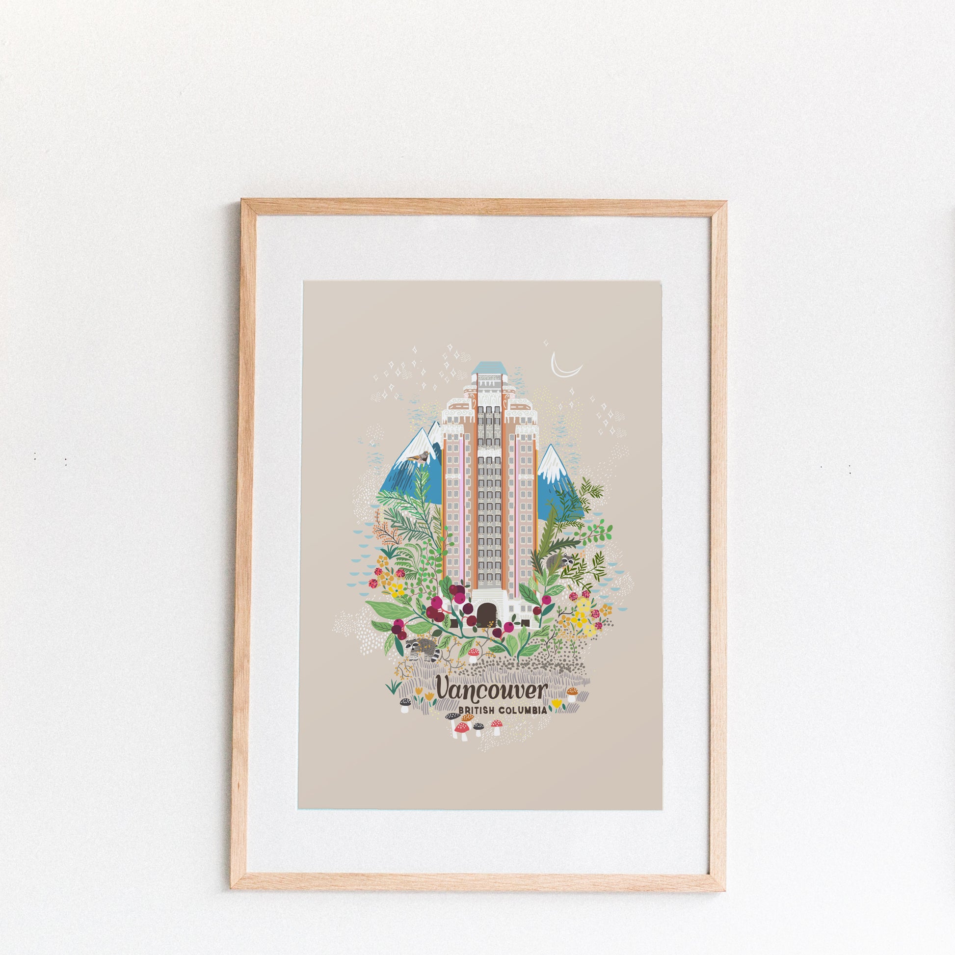 The Marine Building is a skyscraper located in downtown Vancouver. At the time of its opening in 1930, it was the city's tallest skyscraper and is one of the most iconic buildings in Vancouver with its beautiful art-deco architecture. Joyful splashes of Pacific Northwest greenery fill the illustration, including huckleberries, ferns, evergreen trees, mushrooms and flowers. Can you spot the cheeky raccoons?