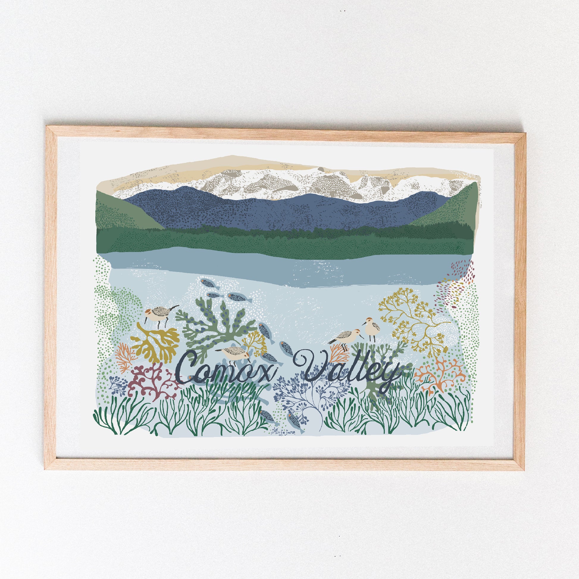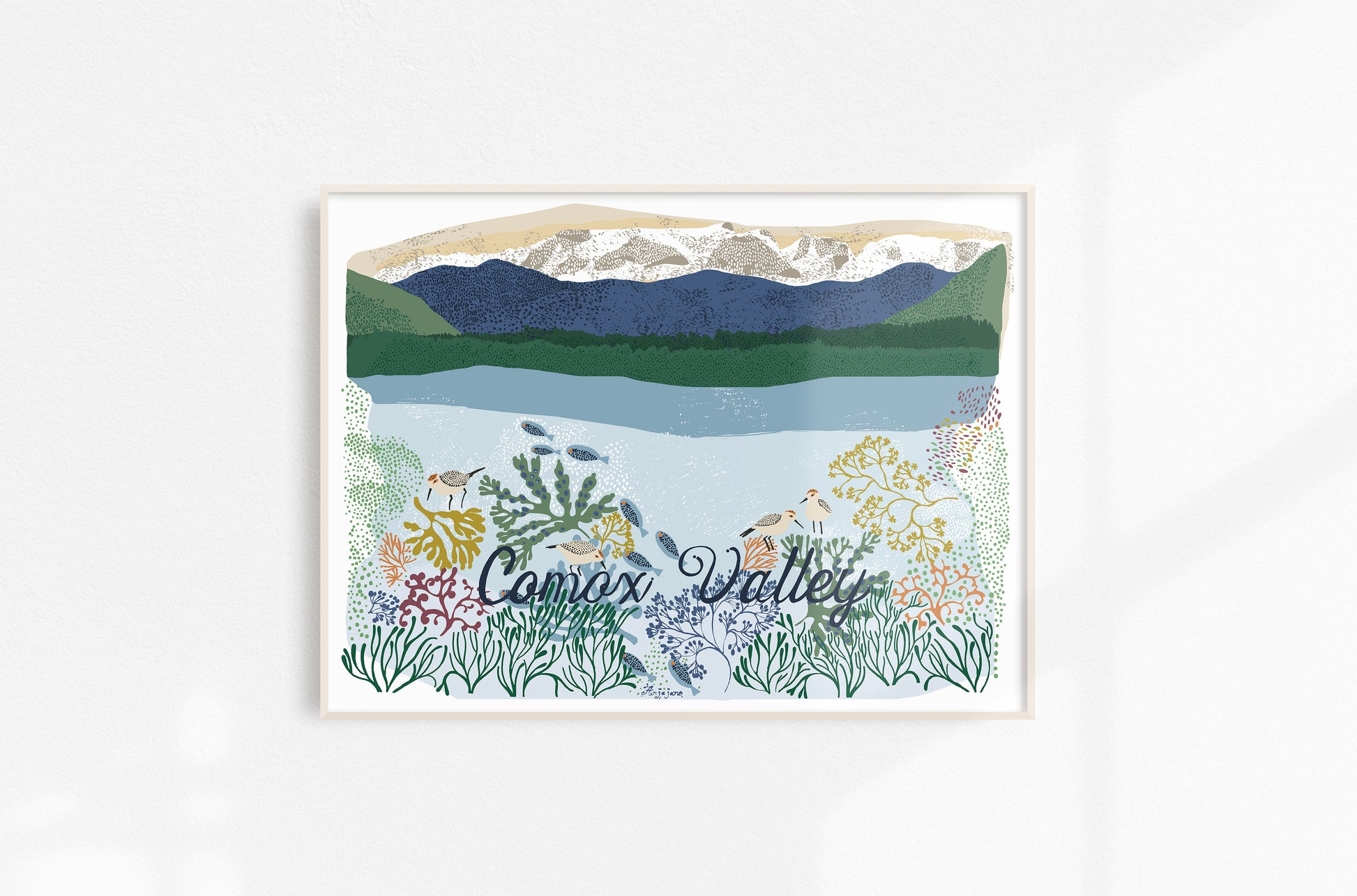 The Comox Glacier rises like a great white whale of the mountains, looming over the Comox Valley. Sandpipers can be seen wading across the shoreline amongst seaweed and plant life.