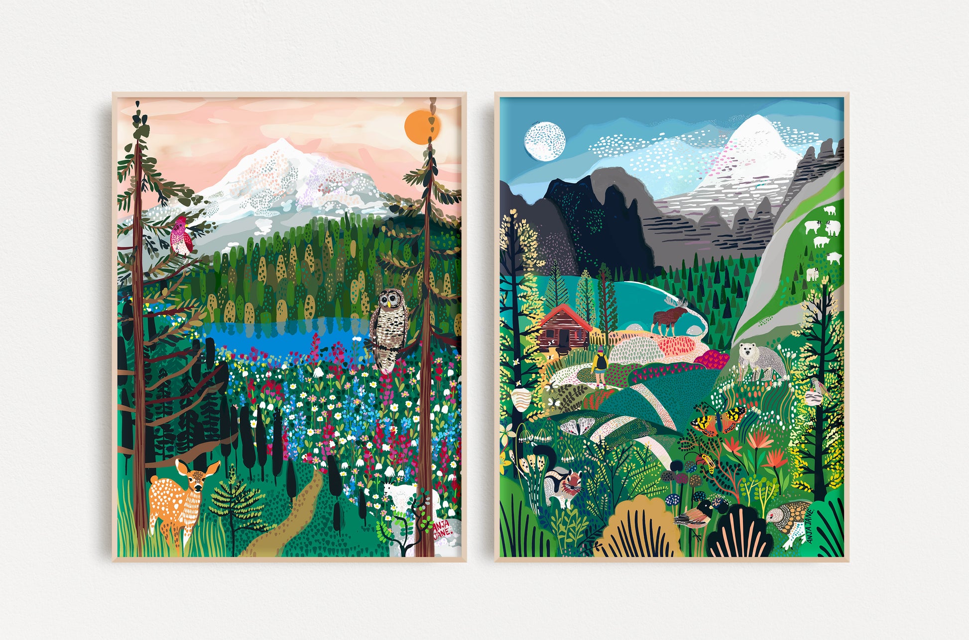 This set includes two of Anja's prints often purchased as a pair: the Tahoma and Canadian Rockies prints, featuring snow-capped mountains, local wildlife, and picturesque scenery.