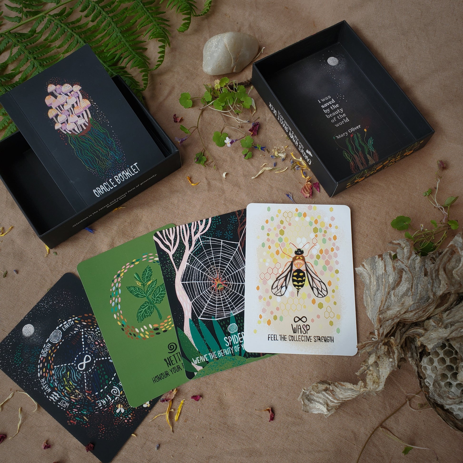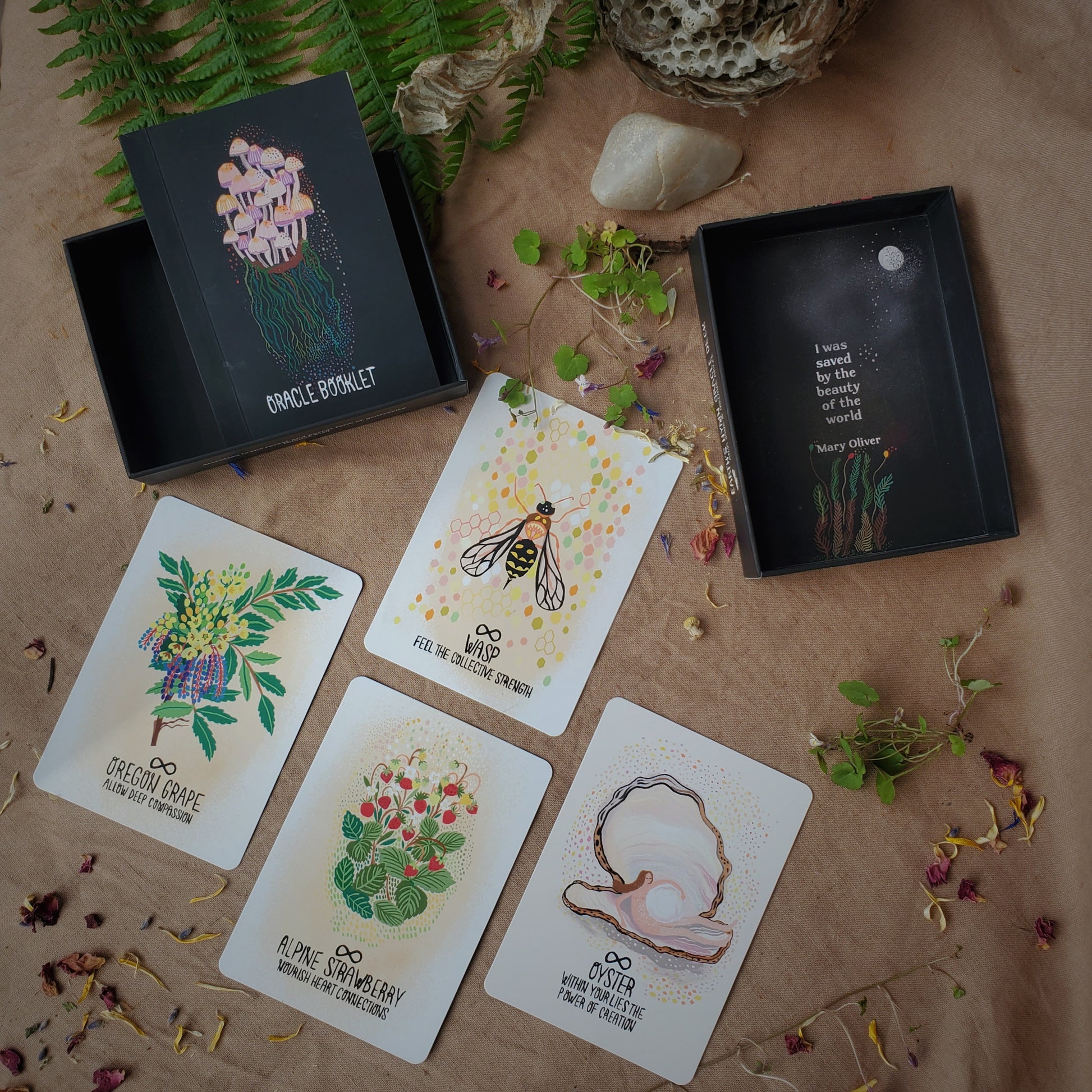Featuring 45 beautifully illustrated cards, each one brings to life a plant, animal, or tree native to their Pacific Northwest island home. Accompanied by a guidebook woven with the energies of Earth, Air, Fire, Water, and Spirit, the deck offers messages that echo the wisdom of the natural world.