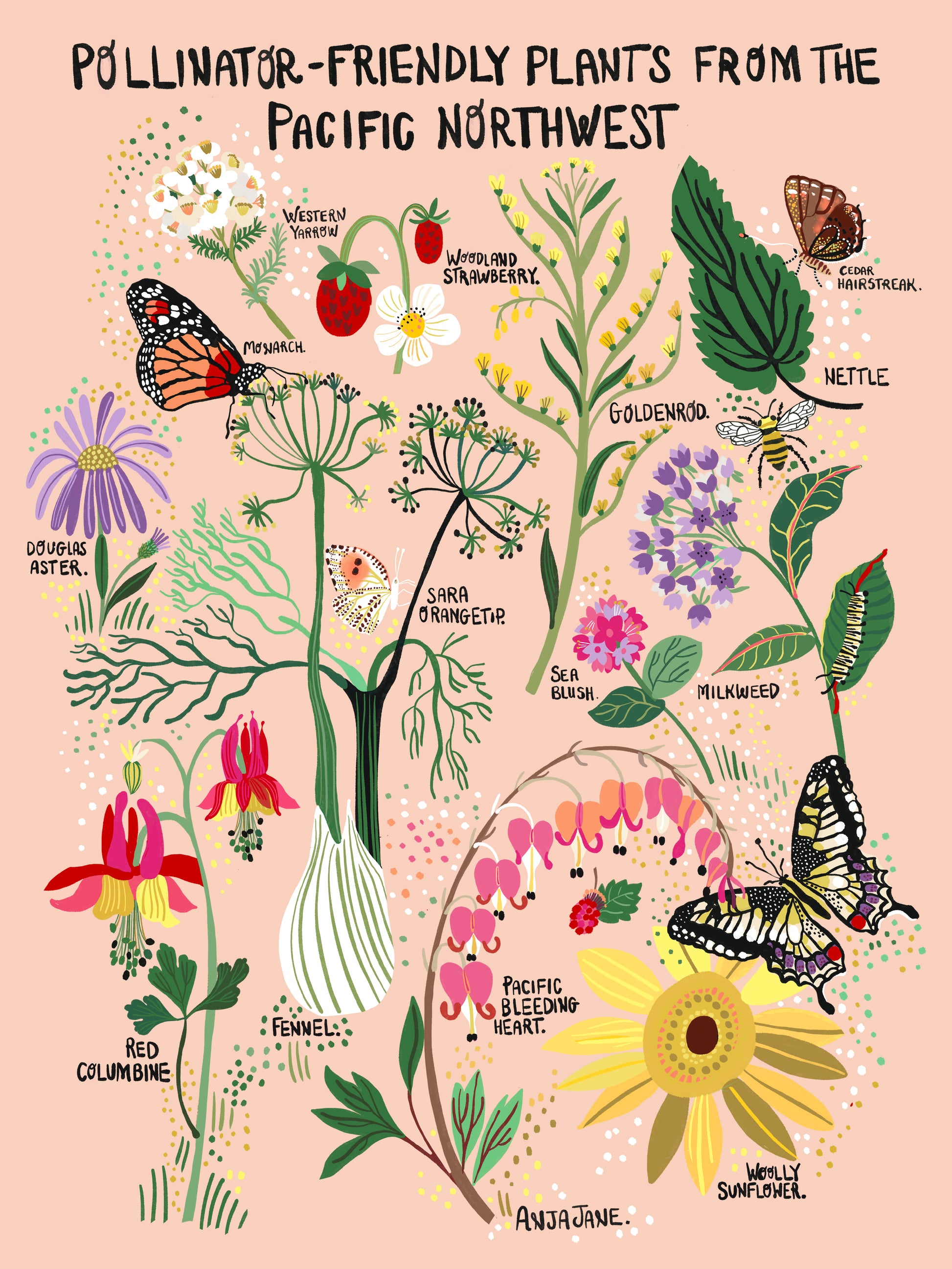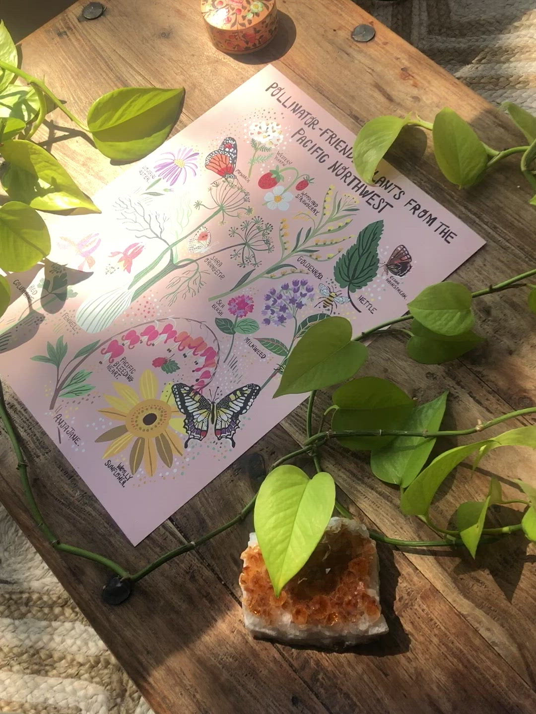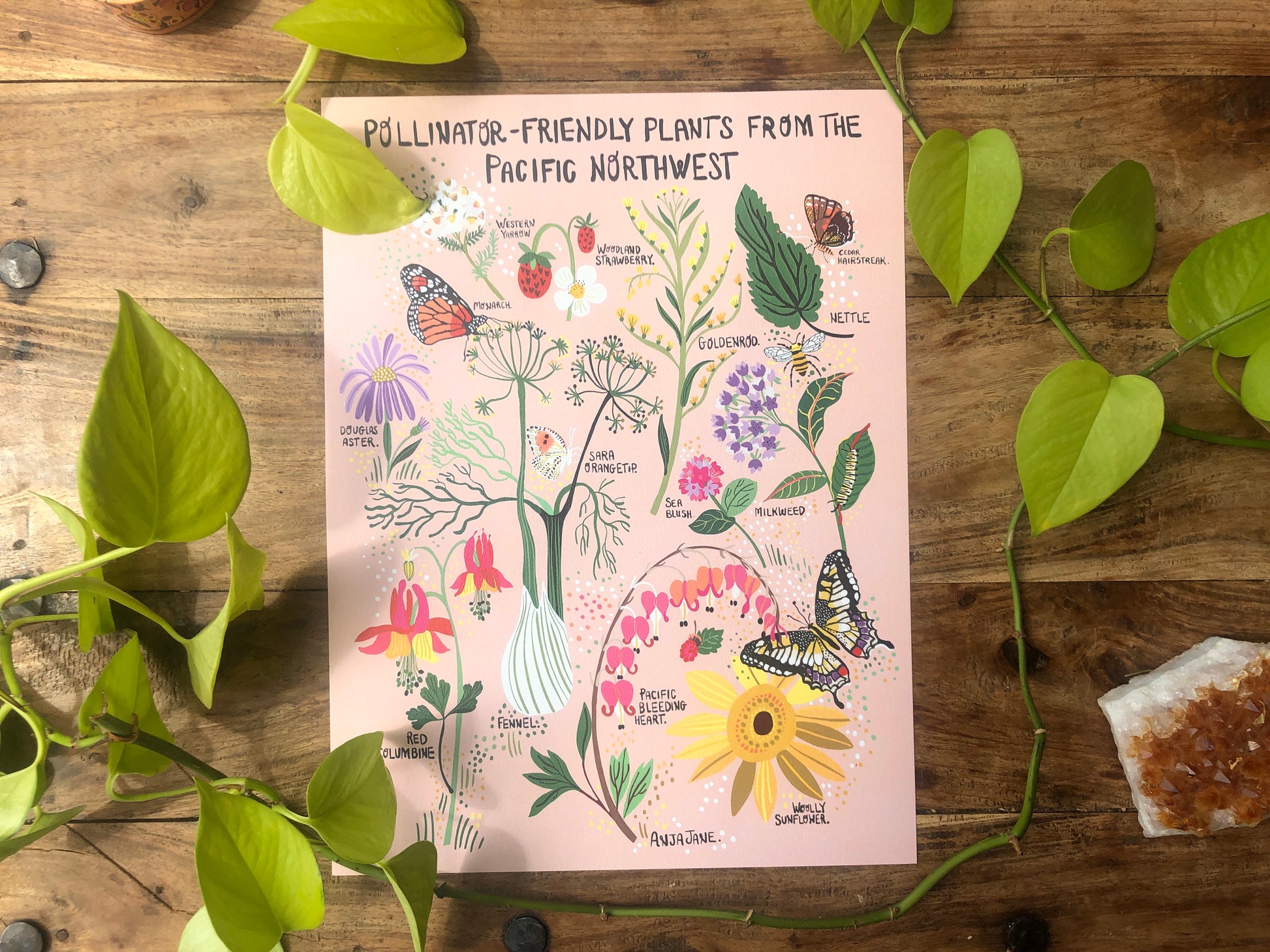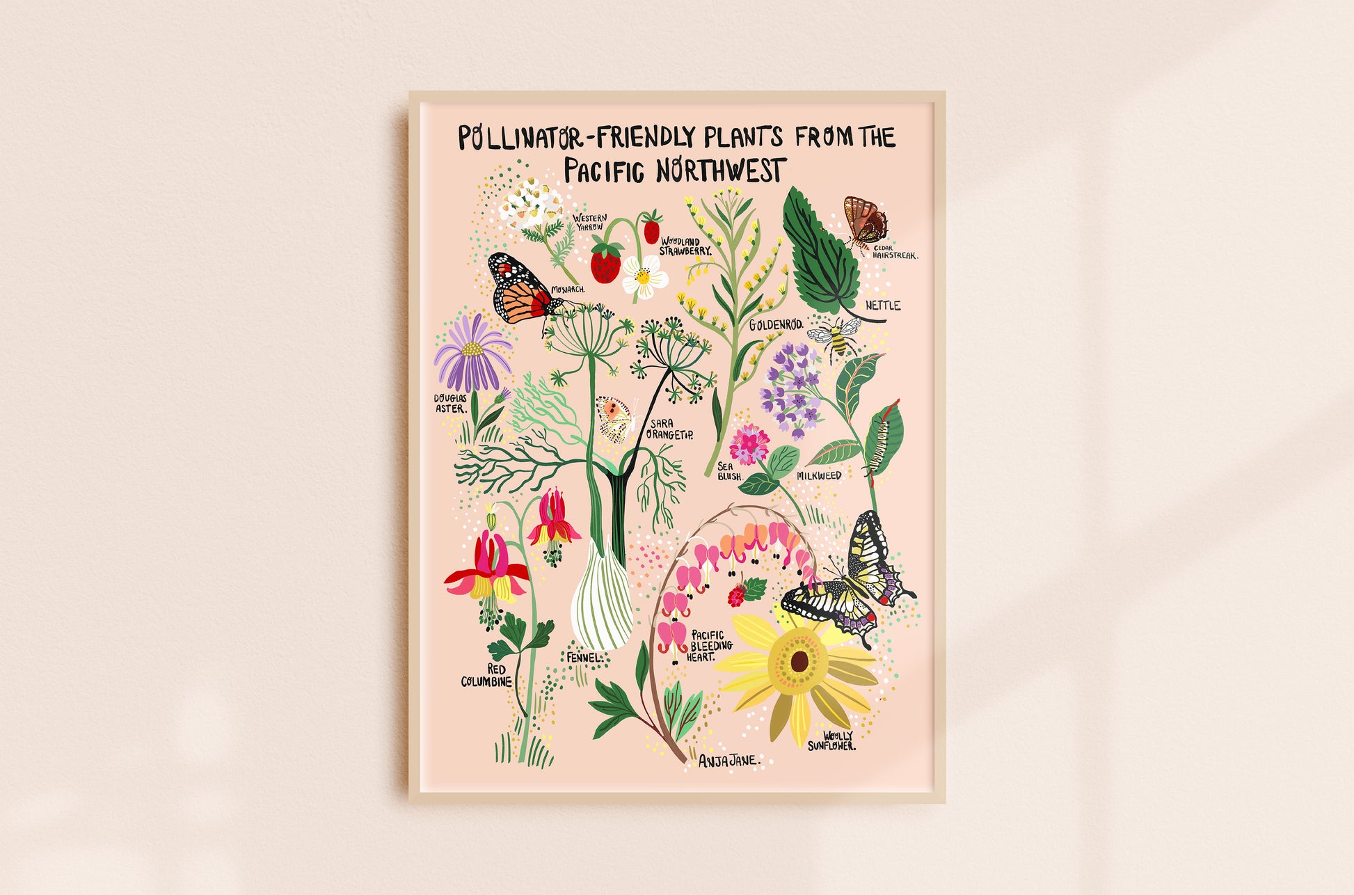 The Pollinator-Friendly Plants of the Pacific Northwest print features flora that attracts butterflies, bees, and other gentle pollinators. Inspired by the vintage natural history prints, this sunny and cheerful art print is as warm and delightful on the eyes as honey is on the tongue.
