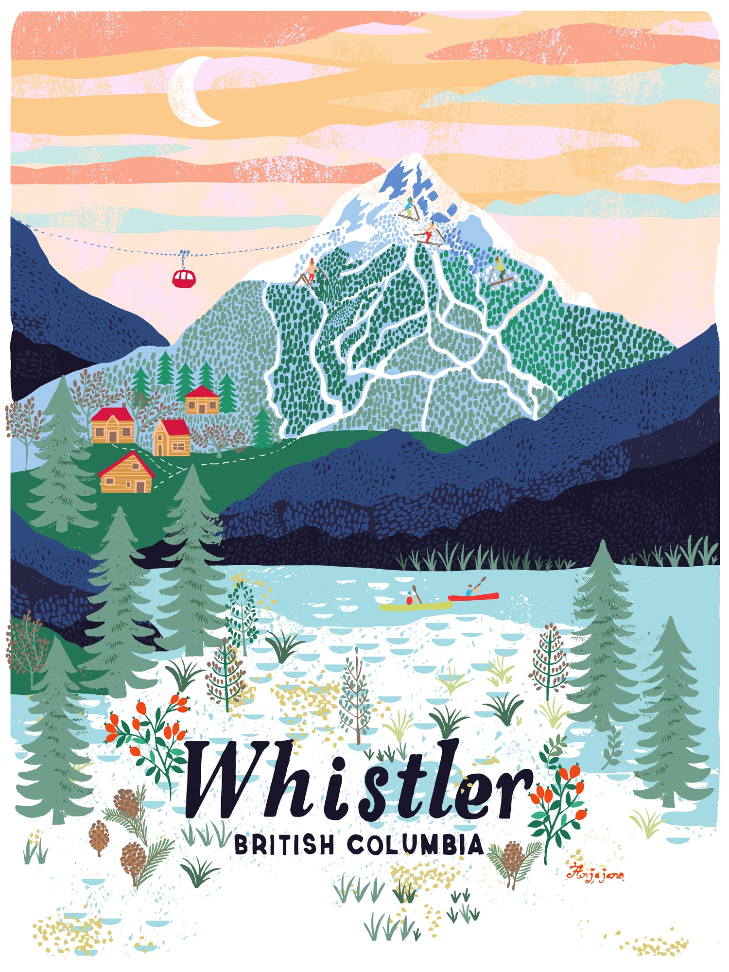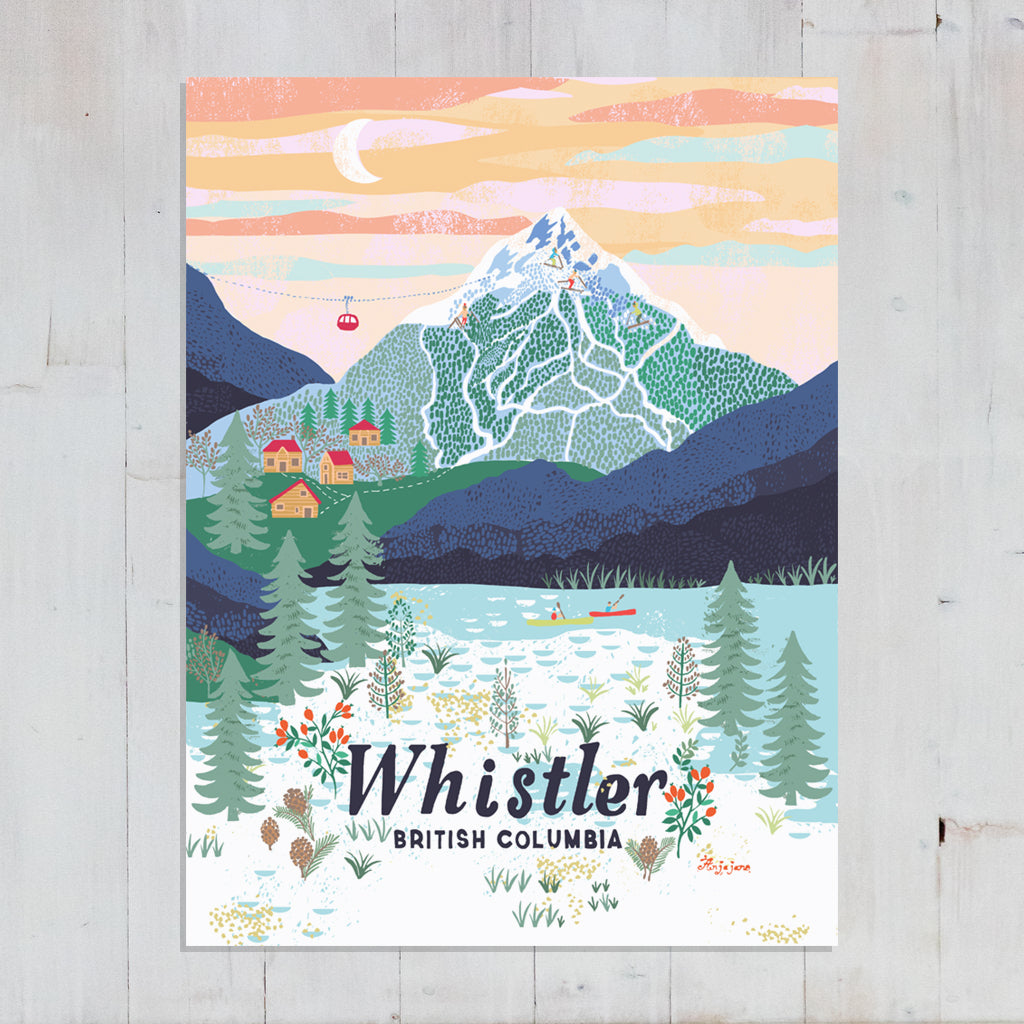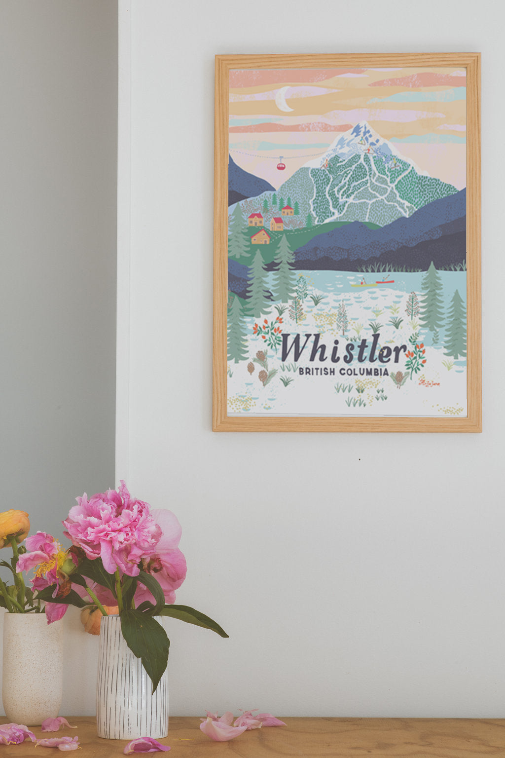 The Whistler art print is the perfect home decor item for any skier or snowboarder. The print features mountains, the Peak 2 Peak Gondola, the snowy slopes of Whistler mountain, and the River of Golden Dreams below (a popular kayaking spot).