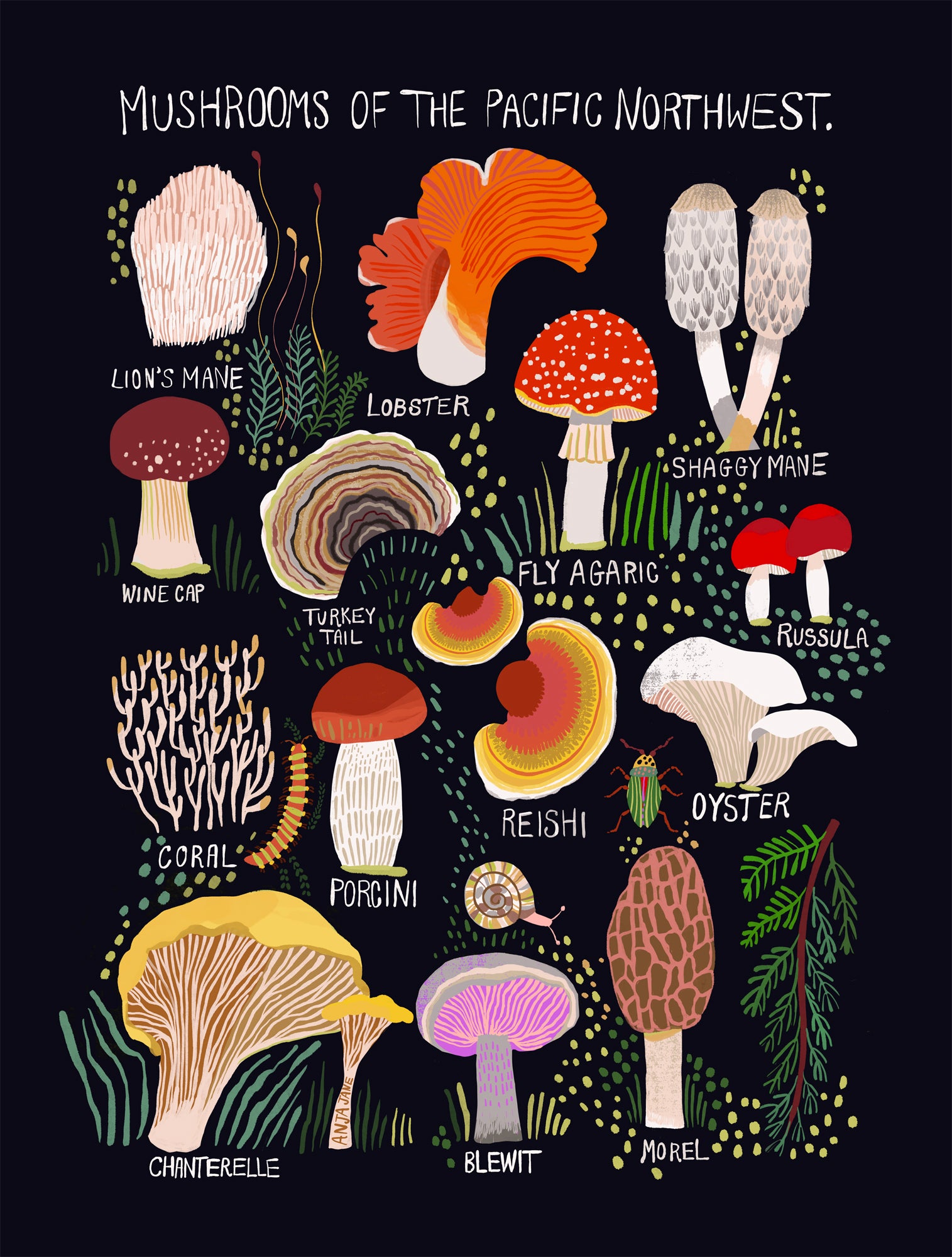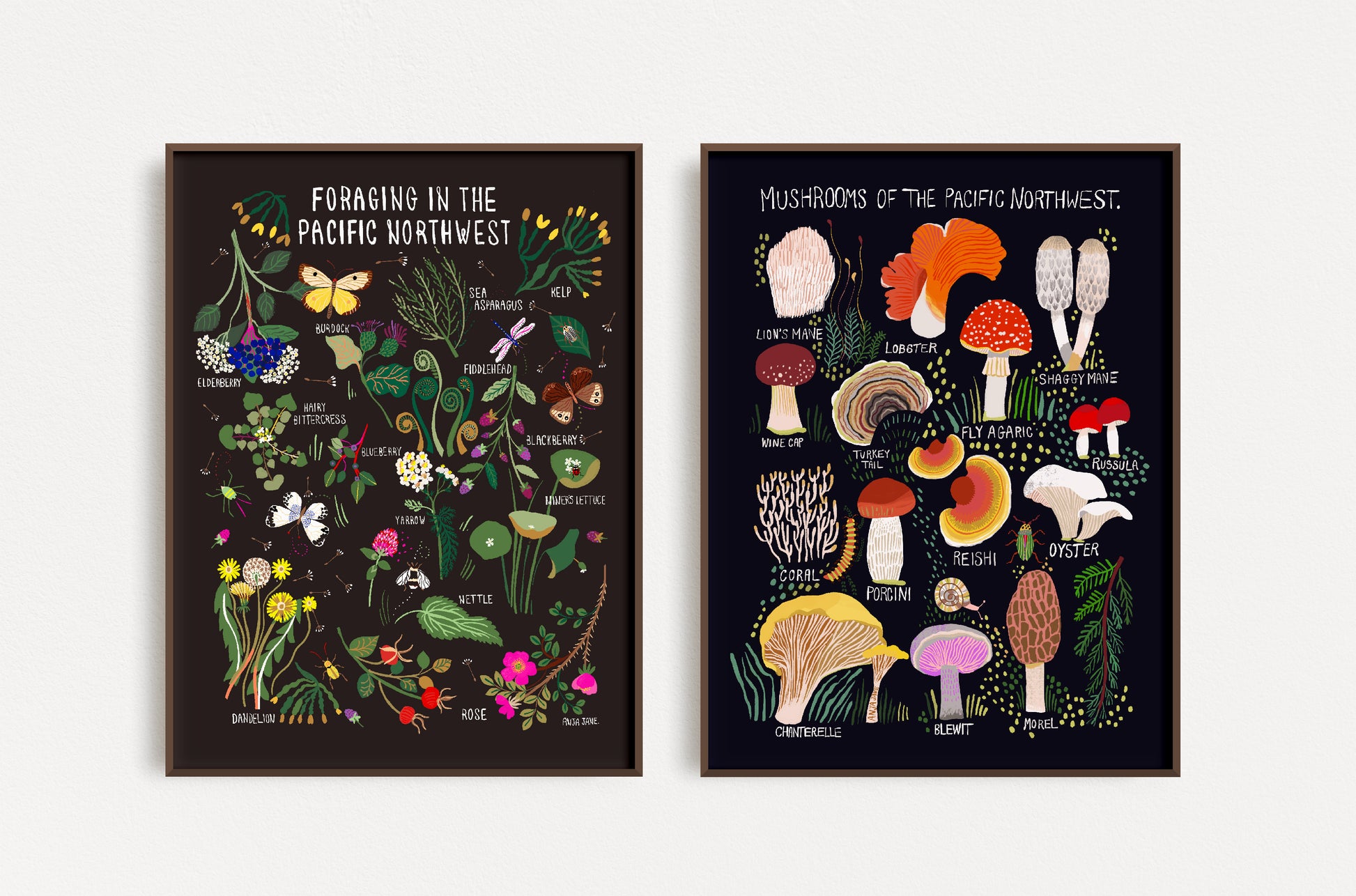 This set includes two of Anja Jane's prints most popular prints: the Mushrooms print and the Foraging print. These prints feature some of the most popular mushrooms found on the coast of British Columbia, as well as wild plants you can forage on the Pacific Northwest.